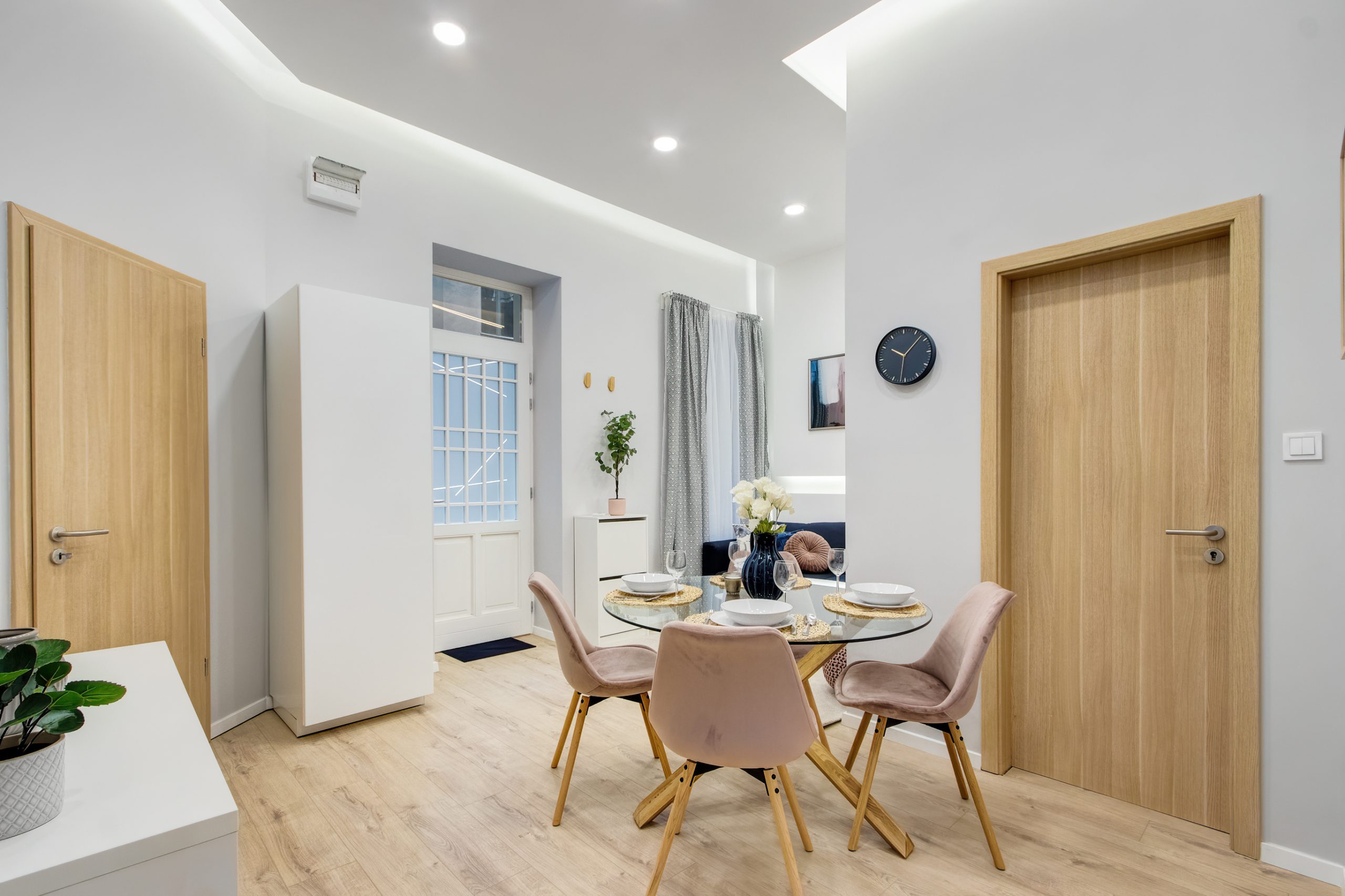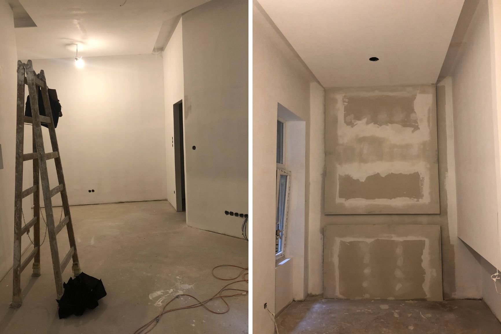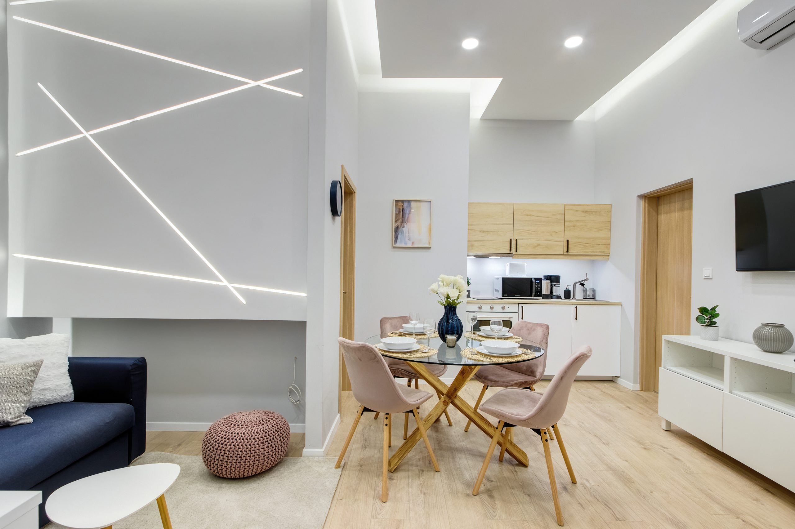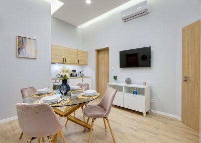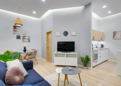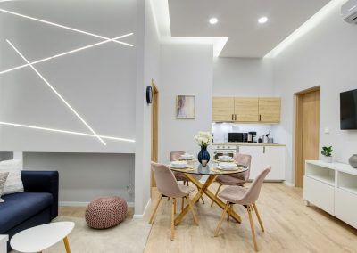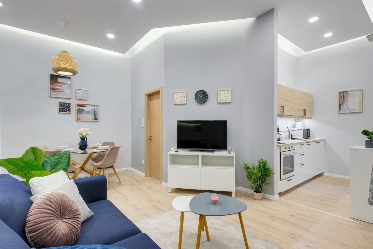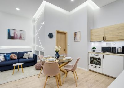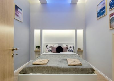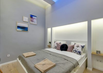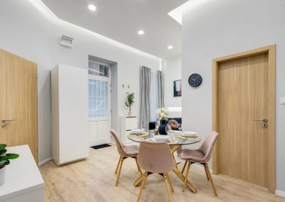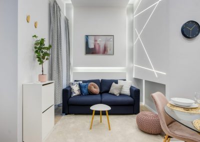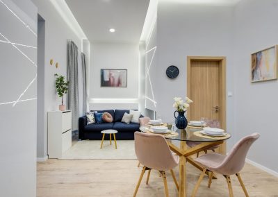 A két kis lakás felújítása teljesen egyben volt kezelve, a cég feladata a felújítás és a design rész megtervezése volt. Izgalmas kihívás volt újra komponálni a lakások kinézetét, de szerencsére a magasabb költségvetés ezt lehetővé tette, ami egyrészt megnyilvánul a fényekben, a design megoldásokban, valamint az izgalmas süllyesztett gipszkarton megoldásokban. Mivel a lakások befektetésre, és kiadásra, vagy eladásra lettek megvásárolva, ezért már az elején törekedtünk arra, hogy a bútorozás után eladhatóvá váljon. Olyan dekorációs elemeket raktunk a lakásokba, amelyek vonzóvá és otthonossá teszik őket, de mégsem kerültek be egyedi és drága bútorok, ugyanis azt tapasztalatunk, hogy ez nem növeli annyira az eladási értéket, mint amennyit belefektettünk. Egy másik tapasztalatunk, hogy mielőtt el van adva egy ingatlan, előtte ki is van adva, ezért fontos, hogy minden berendezés pótolható legyen. A két lakás felújítását körülbelül 2020 Augusztusában fejeztük be, és mindeközben sajnos sok nehézség adódott. Az egyik ilyen kihívás pont akkor jelentkezett, amikor már épp teljesen készen lett a felújítás, de a felette lévő lakásban eltört a fővezeték. Emiatt a teljes lakás szétázott, mindent beborított a penész, és tocsogott víztől a padló. Az sem segített a helyzeten, hogy másnap érkeztek a bútorok, és sajnos az IKEA nem rugalmas a kiszállítás időpontját illetően. Nagyon sokat kellett egyeztetni a biztosítóval, majd kérdéses volt, hogy ki újítsa fel a kár után a lakásokat. Nagy szerencsénkre újra elvállalta ugyanaz a felújítós csapat a projektet. Gyorsan intézkedtünk, fel kellett szedni a teljes padlót, kiszárítani, újra burkolni parkettával, falakat újra festeni stb.