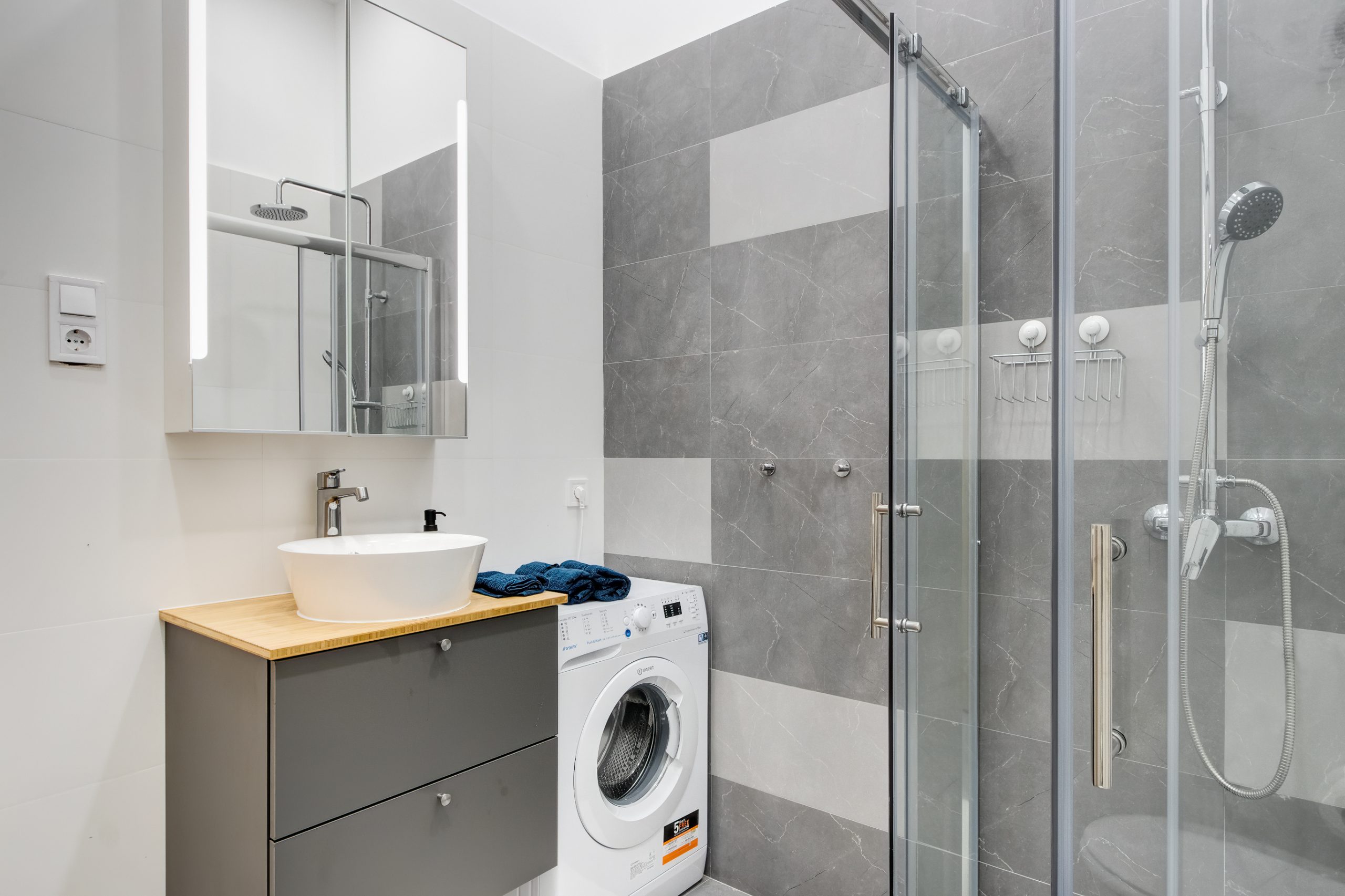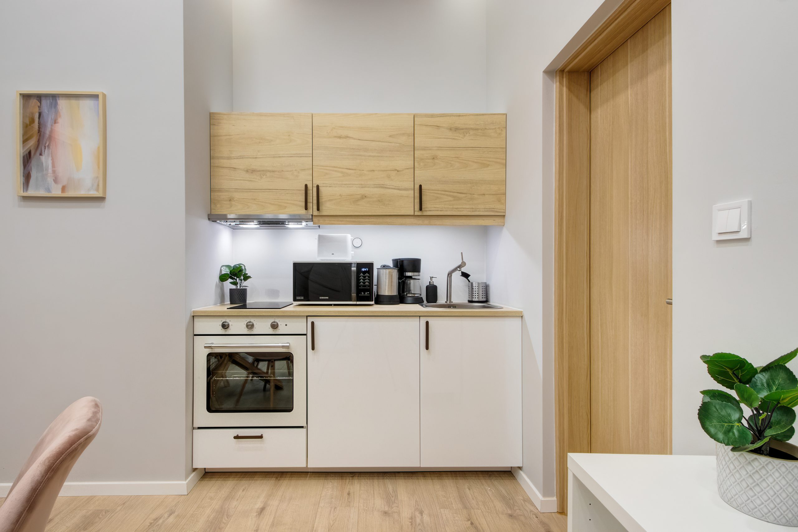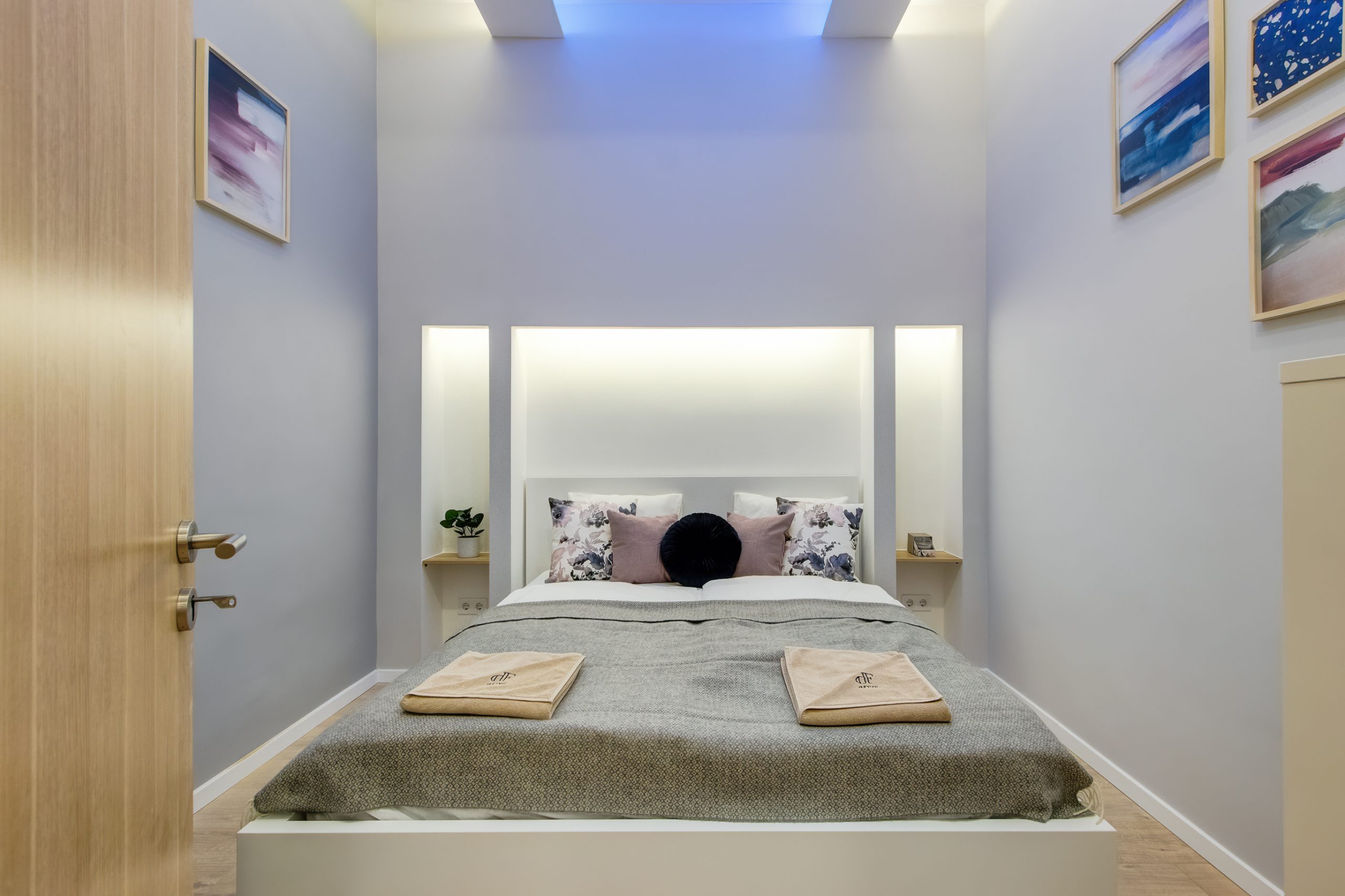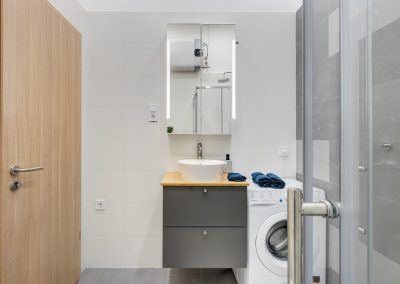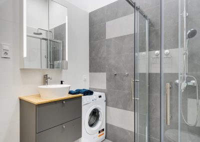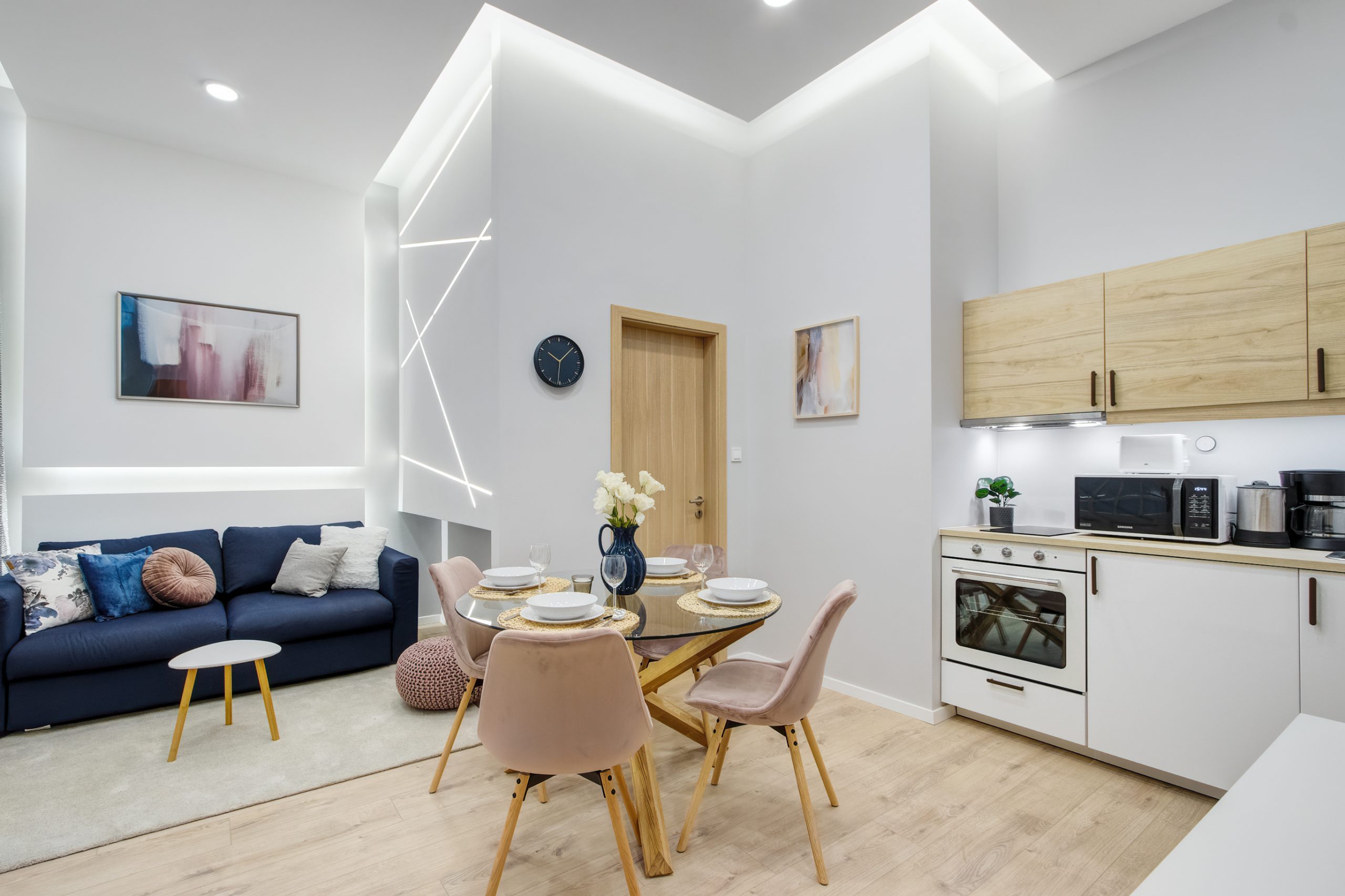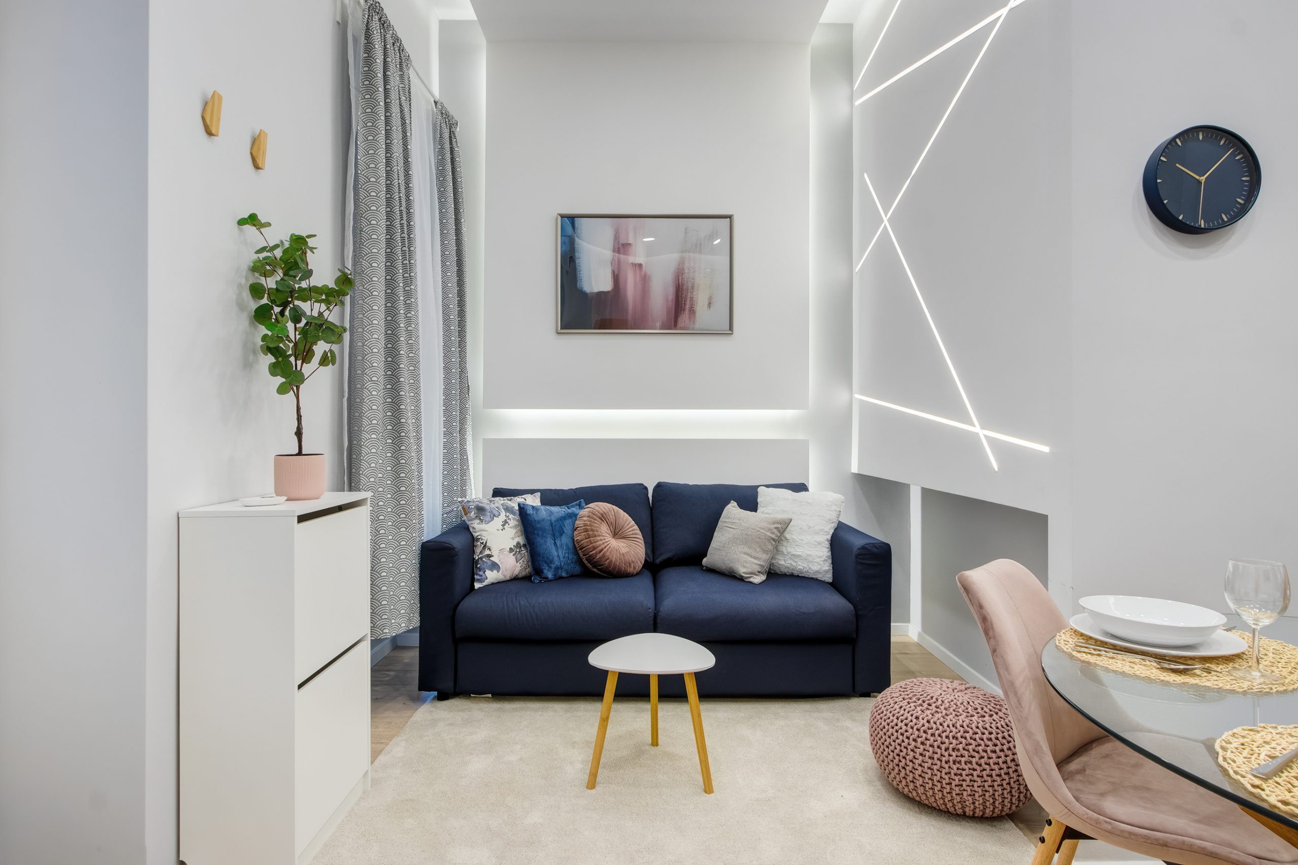 A két kis lakás felújítása teljesen egyben volt kezelve, a cég feladata a felújítás és a design rész megtervezése volt. Izgalmas kihívás volt újra komponálni a lakások kinézetét, de szerencsére a magasabb költségvetés ezt lehetővé tette, ami egyrészt megnyilvánul a fényekben, a design megoldásokban, valamint az izgalmas süllyesztett gipszkarton megoldásokban. Mivel a lakások befektetésre, és kiadásra, vagy eladásra lettek megvásárolva, ezért már az elején törekedtünk arra, hogy a bútorozás után eladhatóvá váljon. Olyan dekorációs elemeket raktunk a lakásokba, amelyek vonzóvá és otthonossá teszik őket, de mégsem kerültek be egyedi és drága bútorok, ugyanis azt tapasztalatunk, hogy ez nem növeli annyira az eladási értéket, mint amennyit belefektettünk. Egy másik tapasztalatunk, hogy mielőtt el van adva egy ingatlan, előtte ki is van adva, ezért fontos, hogy minden berendezés pótolható legyen. A két lakás felújítását körülbelül 2020 Augusztusában fejeztük be, és mindeközben sajnos sok nehézség adódott. Az egyik ilyen kihívás pont akkor jelentkezett, amikor már épp teljesen készen lett a felújítás, de a felette lévő lakásban eltört a fővezeték. Emiatt a teljes lakás szétázott, mindent beborított a penész, és tocsogott víztől a padló. Az sem segített a helyzeten, hogy másnap érkeztek a bútorok, és sajnos az IKEA nem rugalmas a kiszállítás időpontját illetően. Nagyon sokat kellett egyeztetni a biztosítóval, majd kérdéses volt, hogy ki újítsa fel a kár után a lakásokat. Nagy szerencsénkre újra elvállalta ugyanaz a felújítós csapat a projektet. Gyorsan intézkedtünk, fel kellett szedni a teljes padlót, kiszárítani, újra burkolni parkettával, falakat újra festeni stb.